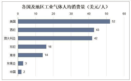 然而我國(guó)工業(yè)氣體行業(yè)規(guī)模與發(fā)達(dá)國(guó)家相比,人均氣體消費(fèi)量還處在較低水平,僅為美國(guó)的1/26,不足西歐與澳洲的1/20,與南美和東歐國(guó)家也有較大差距,未來(lái)仍有較大的增量空間。