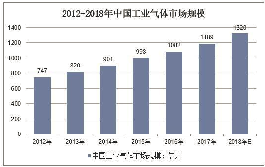 我國(guó)工業(yè)氣體市場(chǎng)在90年代開(kāi)始高速發(fā)展,2010年市場(chǎng)規(guī)模已超過(guò)410億元,2015年規(guī)模超過(guò)1000億元,2017年中國(guó)工業(yè)氣體市場(chǎng)規(guī)模已達(dá)到1200億元,年均增長(zhǎng)率穩(wěn)定在8%,預(yù)計(jì)2018年可超過(guò)1300億元。